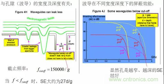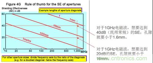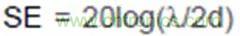 在一個(gè)完美的屏蔽殼體上開一個(gè)洞,相當(dāng)于構(gòu)成一個(gè)半波共振縫隙天線,屏蔽效能SE與孔的最大尺寸d、電磁波波長λ關(guān)系如下: