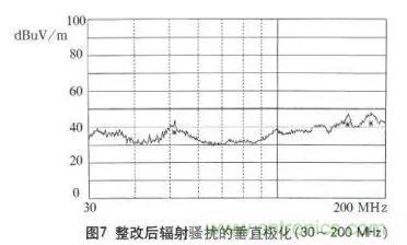 由測試結果可以看出,通過電磁兼容設計在傳導騷擾抑制方面取得了良好效果,在高頻段輻射騷擾的設計也達到了預期效果,下面還需對在30~200MHz頻段范圍內的輻射騷擾進行改進設計。