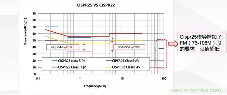 歷史上普遍接受的國際電磁干擾標(biāo)準(zhǔn)是CISPR-22,美國的電磁干擾標(biāo)準(zhǔn)是FCC,CISPR-22與FCC有所不同,但一般來說如果電源符合CISPR-22標(biāo)準(zhǔn),那么它也符合FCC標(biāo)準(zhǔn)。總之CISPR-22標(biāo)準(zhǔn)已經(jīng)成為全世界都遵守的基本標(biāo)準(zhǔn)。汽車上的電磁干擾標(biāo)準(zhǔn)是CISPR-25,相對CISPR22來說CISPR-25標(biāo)準(zhǔn)限制值更低并且額外對FM頻段做了很嚴(yán)的限制要求。具體傳導(dǎo)測試限制要求如圖2所示。