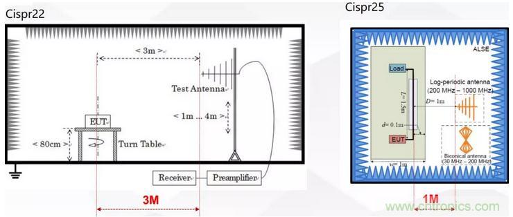 如圖3所示電磁干擾的輻射測試普遍采用天線接收法測試,相比于CISPR22來說CISPR25額外增加了150KHz ~ 30MHz的輻射測試,這部分測試頻段覆蓋了DCDC的工作頻率范圍,是輻射測試的難點(diǎn)。另外CISPR-25輻射測試采用1M法天線距離更近,測試接收的信號更強(qiáng)。