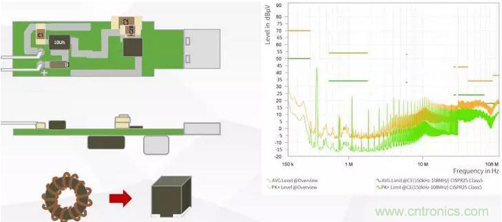 環(huán)形電感的漏磁較大,體積也比較大,對大地也有比較大的耦合電容,因此其對外的輻射更大,如圖8所示將環(huán)形電感替換為貼片電感后整體的EMI就會(huì)下降很多。