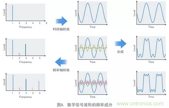 在我學(xué)生時代碰到的噪聲中,計算機的時鐘頻率約為4MHz。但是,例如在日本,用于調(diào)頻廣播的頻段為76MHz或更高。噪聲源的時鐘頻率不會與廣播頻率重疊。那問題為什么會出現(xiàn)呢?數(shù)字信號是由基波正弦波和其整數(shù)倍的諧波組成的方波,如圖A所示。方波的上升越急劇,其包含的高次諧波分量越高。這意味著實際的數(shù)字信號具有與調(diào)頻廣播頻帶重疊的諧波分量,從而導(dǎo)致調(diào)頻收音機的聲音中產(chǎn)生噪聲。