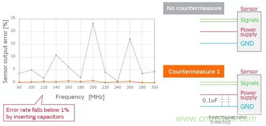 傳感器的電源線受噪聲影響,會發(fā)生傳感器輸出值的異常(輸出誤差)。將注入電源線的噪聲級固定,對對策前后的輸出誤差的大小進行調(diào)查。