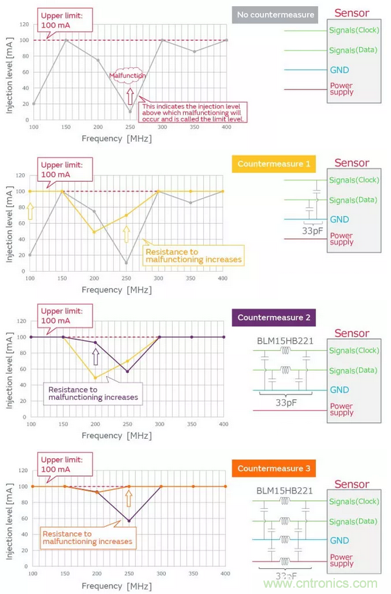 傳感器的信號線收到噪聲影響,傳感器的通信會發(fā)生停止。提高注入的噪聲水平,調(diào)查能夠正常工作(不發(fā)生誤操作)的水平極限。