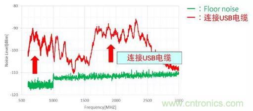圖3:連接USB電纜前后進(jìn)入天線的噪聲的對(duì)比