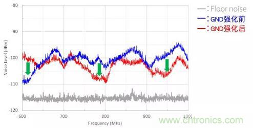 但是,如果電纜屏蔽部分有噪聲,可能會(huì)從這里發(fā)射噪聲。 因此我們采取了地平面強(qiáng)化的對(duì)策。