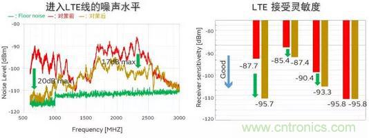 通過這些對(duì)策,如圖8所示,天線中進(jìn)入的噪聲最大可降低20dB,LTE的接收靈敏度取決于頻帶,改善了8dB。