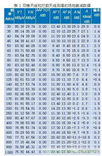 表1:雙錐天線(xiàn)和對(duì)數(shù)天線(xiàn)測(cè)得的場(chǎng)地衰減數(shù)據(jù)