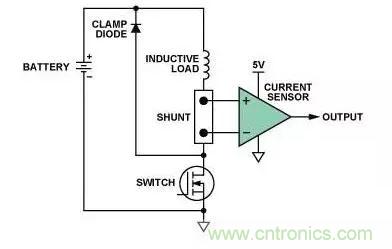 本例將詳細介紹一種典型的高端電流檢測應(yīng)用。圖1所示為汽車應(yīng)用環(huán)境中用于監(jiān)控電磁閥或其它感性負載的常見配置。