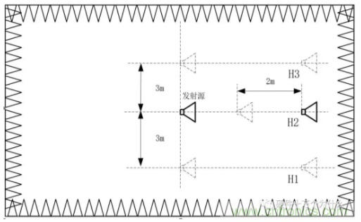 測試近場工作區(qū)反射電平時,發(fā)射天線先置于暗室中心軸線上,接收天線置于正對被測墻壁的一個合理位置,并沿兩天線軸線移動一段距離進行反射電平的測試。測試位置如圖所示。