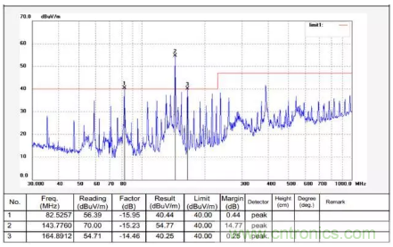 某行車記錄儀,測試的時(shí)候要加一個(gè)外接適配器,在機(jī)器上電運(yùn)行測試時(shí)發(fā)現(xiàn)超標(biāo),具體頻點(diǎn)是84MHZ、144MH、168MHZ,需要分析其輻射超標(biāo)產(chǎn)生的原因,并給出相應(yīng)的對策。輻射測試數(shù)據(jù)如下: