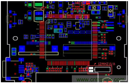該產(chǎn)品只有一塊PCB,其上有一個(gè)12MHZ的晶體。其中超標(biāo)頻點(diǎn)恰好都是12MHZ的倍頻,而分析該機(jī)器容易EMI輻射超標(biāo)的屏和攝像頭,發(fā)現(xiàn)LCD-CLK是33MHZ,而攝像頭MCLK是24MHZ;通過排除發(fā)現(xiàn)去掉攝像頭后,超標(biāo)點(diǎn)依然存在,而通過屏蔽12MZH晶體,超標(biāo)點(diǎn)有降低,由此判斷144MHZ超標(biāo)點(diǎn)與晶體有關(guān),PCB布局如下: