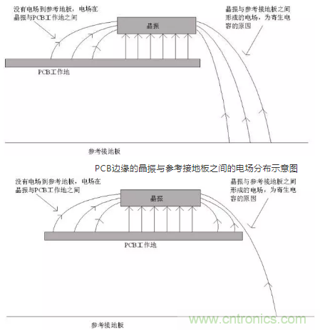 從圖中可以看出,當(dāng)晶振布置在PCB中間,或離PUB邊緣較遠(yuǎn)時(shí),由于PCB中工作地(GND)平面的存在,使大部分的電場控制在晶振與工作地之間,即在PCB內(nèi)部,分布到參考接地板去的電場大大減小,導(dǎo)致輻射發(fā)射就降低了。