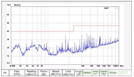 將晶振內(nèi)移,使其離PCB邊緣至少1cm以上的距離,并在PCB表層離晶振1cm的范圍內(nèi)敷銅,同時(shí)把表層的銅通過過孔與PCB地平面相連。經(jīng)過修改后的測試結(jié)果頻譜圖如下,從圖可以看出,輻射發(fā)射有了明顯改善。