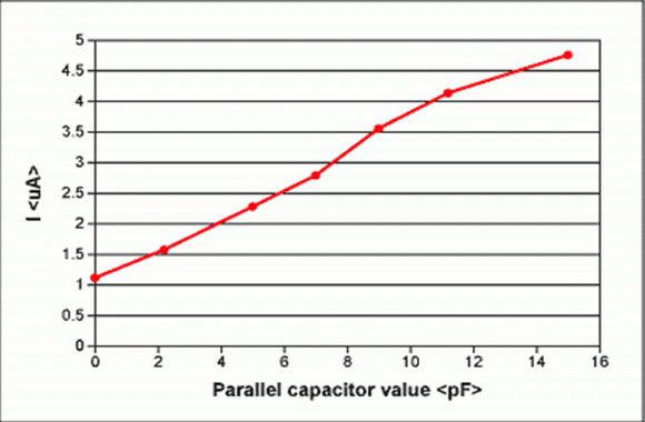 圖4. 晶體振蕩器電流與附加的并聯(lián)負載電容的關系