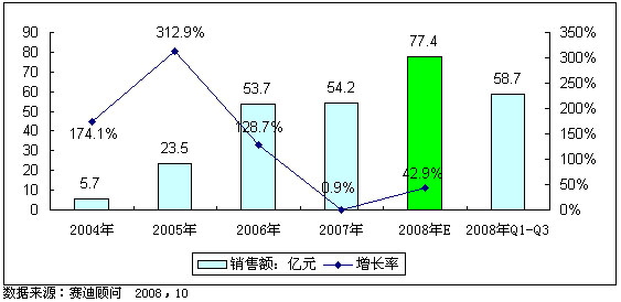 圖2 2004-2008年中國數(shù)字電視機(jī)頂盒市場銷售額及預(yù)測(cè)