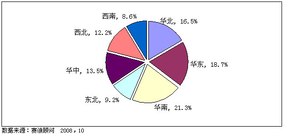 圖4 2008年前三季度中國數(shù)字電視機(jī)頂盒區(qū)域市場銷量結(jié)構(gòu)