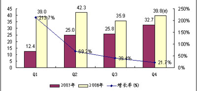賽迪顧問數(shù)據(jù)顯示,2007年中國(guó)PND市場(chǎng)一路飆升,2008年仍保持了平穩(wěn)快速增長(zhǎng),前三季度市場(chǎng)銷售量達(dá)到117.2萬臺(tái),同比增長(zhǎng)率為85.5%。盡管宏觀經(jīng)濟(jì)環(huán)境低迷,進(jìn)入第四季度PND傳統(tǒng)旺季,PND市場(chǎng)仍表現(xiàn)優(yōu)異,銷量將超過第三季度實(shí)現(xiàn)環(huán)比增長(zhǎng)。 圖1 2007~2008年中國(guó)PND市場(chǎng)銷售量對(duì)比