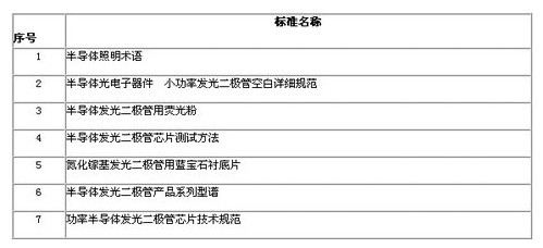 標準的目的在于加強生產(chǎn)的一致性、提升質(zhì)量、并增進生產(chǎn)效率,若欲提升LED的制造質(zhì)量,在全球化的競爭脫穎而出,標準是一項不可或缺的工具,因此加速對LED標準的制定是各國政府及業(yè)界非常重視的問題。2007年在半導(dǎo)體照明標準工作指導(dǎo)委員會的指導(dǎo)下,由“國家半導(dǎo)體照明工程研發(fā)及產(chǎn)業(yè)聯(lián)盟”成立“聯(lián)盟標準化協(xié)調(diào)推進工作組”,以負責(zé)協(xié)調(diào)中國的LED標準進度。而目前最新進展是由“全國照明電器標準化技術(shù)委員會”提出的普通照明用LED國家標準及行業(yè)標準等10多項標準目前都在送審階段,預(yù)計于今年陸續(xù)頒布實施,如表所示。