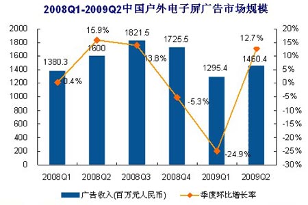 易觀國際分析認(rèn)為,由于部分細(xì)分市場(chǎng)尚未走出宏觀經(jīng)濟(jì)下滑的困境,加上整體市場(chǎng)的反彈并不強(qiáng)勁,因此本季度整體市場(chǎng)規(guī)模未達(dá)到去年同期的水平,預(yù)計(jì)目前中國宏觀經(jīng)濟(jì)的好轉(zhuǎn)對(duì)戶外電子屏廣告市場(chǎng)的促進(jìn)作用將在下半年顯現(xiàn)。