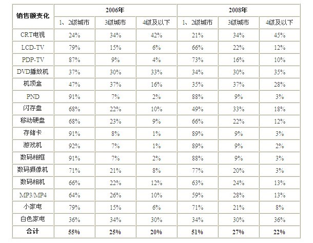 表1 2006年與2008年中國主要消費(fèi)電子終端產(chǎn)品不同級別城市銷售額結(jié)構(gòu)變化