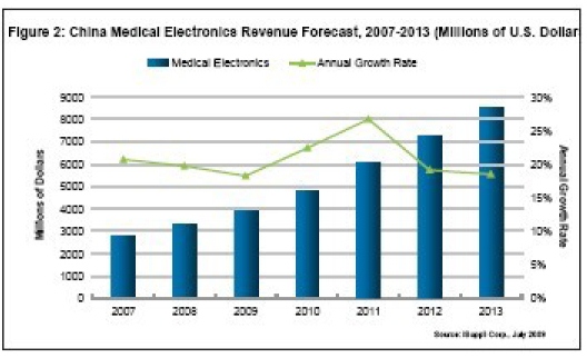 瑞銀集團(tuán)(UBS)的投資部門估算,醫(yī)院補(bǔ)貼中的三分之一,相當(dāng)于141 億美元,將用于初級(jí)醫(yī)院購(gòu)買新的醫(yī)療設(shè)備。即使這項(xiàng)政策的執(zhí)行有所滯后,這141 億美元也將推動(dòng)醫(yī)療設(shè)備產(chǎn)業(yè)每年增長(zhǎng)20%。由此可以預(yù)計(jì),未來(lái)三年醫(yī)療電子市場(chǎng)的年增長(zhǎng)率將超過(guò)25%。