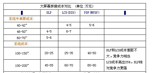 從總體系統(tǒng)分析,100-150”系統(tǒng)中,DLP平均成本為20~25萬元左右,而LCD和DLP的差距已經縮小到10萬元以內,成本競爭力基本相當。在150”以上超大拼接系統(tǒng)中,LCD的成本要高出DLP大約25-30%,而MPDP更是要高出30%以上,這一領域DLP的成本競爭力優(yōu)勢比較明顯。