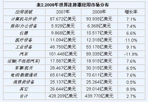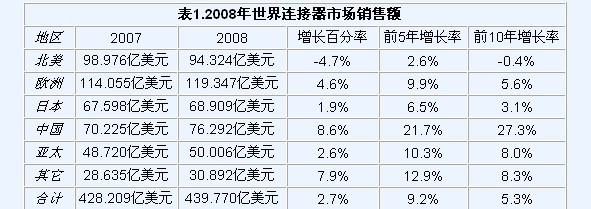 專業(yè)的連接器市場研究公司-Bishop&Associates于2009年4月公布了2008年世界連接器工業(yè)市場數(shù)據(jù),數(shù)據(jù)顯示受世界經(jīng)濟危機的拖累,2008年世界連接器工業(yè)銷售增幅急劇下滑,與上一年相比,僅增長2.7%,而2007年的增幅為7.2%,盡管如此,連接器工業(yè)仍然實現(xiàn)了6年的連續(xù)增長(2003 年11.2%, 2004年17.9%,2005年6.2%,2006年12.6%,2007年7.2%,2008年2.7%),與經(jīng)濟危機下其它電子元器件普遍負增長的糟糕表現(xiàn)相比,這一增長數(shù)字,是令人欣慰的。