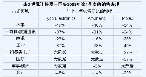 2009年第一季度已經(jīng)過去,連接器產(chǎn)品訂單劇降41.7%,銷售則下挫了35.7%,這兩項數(shù)據(jù)結(jié)果均創(chuàng)下了連接器工業(yè)的歷史新低。在上一次表現(xiàn)最糟糕的2002年第四季度,銷售和定單下降了31.2%。所有最終應(yīng)用市場均報告直線下降,一片蕭條跡象。三家世界最大的連接器公司泰科電子(Tyco Electronics)、安費諾(Amphenol)和莫列克斯(Molex)也均報告與上一年同比銷售嚴重下降,如下表3所示。