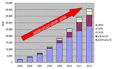 - 2009年薄膜(Thin Film) 太陽能電池的產(chǎn)能達(dá)到3.58 GW (35.8億瓦)