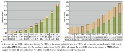 該市場研究公司還表示,雖然PM OLED顯示屏的單位出貨量到2015年將一直增長,但其收入將保持平穩(wěn)。與此同時,AM OLED的單位出貨量將增加兩倍,并將在2011年超過PM OLED的出貨量(圖1b)。