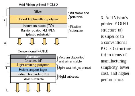 Add-Vision的印刷P-OLED技術提供了許多主流OLED具有的有吸引力的特性,但制造更容易、成本更低。該公司開發(fā)出一種混配的P-OLED LEP墨水,它是把LEP與添加劑和輸送材料進行特殊摻混和配制得到的。