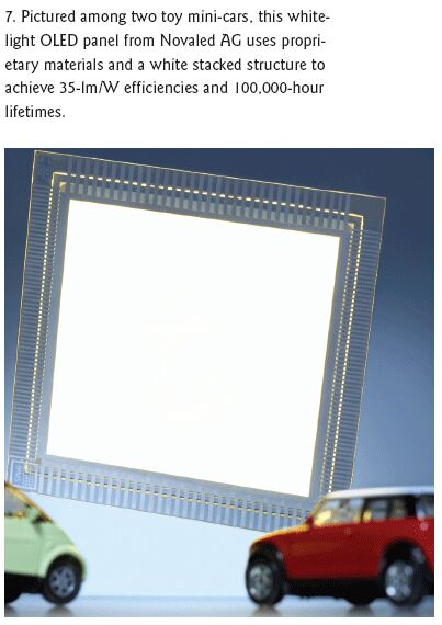 成員之一的歐司朗半導體公司去年展示了一款10×10cm的OLED面板,它在1000cd/m2條件下,具有30至50lm/W的光輸出,壽命為5000小時。在歐司朗這一工作的中間環(huán)節(jié),還證明了OLED的白光輸出能比以前取得的較低水平有提高。歐司朗采用的是基本的真空沉積技術,使用的是小分子而不是可打印聚合物(圖6)。歸功于與BASF AG的合作,該面板的光輸出后增至60lms/W。