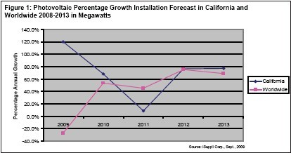 圖1所示為iSuppli公司對(duì)于2009至2013年加州以及全世界光伏系統(tǒng)安裝增長情況的預(yù)測。