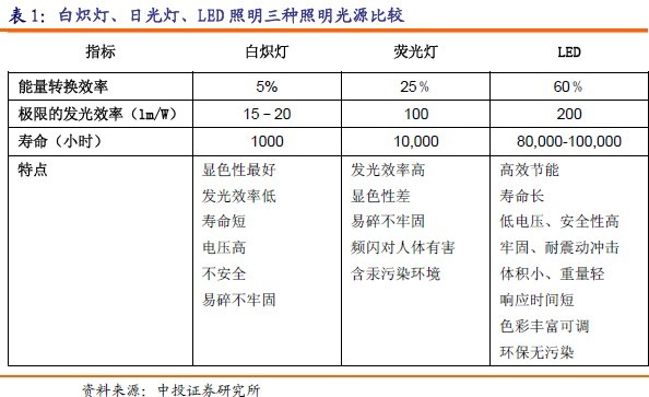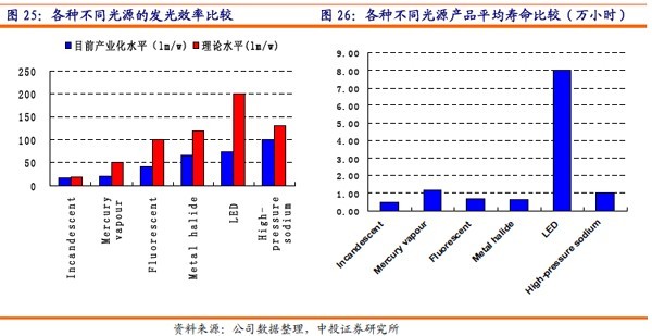 LED燈相對于其他光源有壽命長、發(fā)光效率提高空間大的優(yōu)勢,并且LED燈由于采用物理P-N結(jié)的冷發(fā)光原理,使得LED燈轉(zhuǎn)化效率高,也不存在汞燈污染源,被譽為綠色環(huán)保的照明能源并不為過。LED燈最高發(fā)光率為200流明/瓦,遠(yuǎn)高于其他的光源產(chǎn)品;其壽命理論值達(dá)到10萬小時,遠(yuǎn)遠(yuǎn)高于其他光源產(chǎn)品。