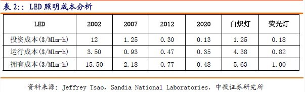 根據(jù)美國圣地亞國家實驗室所做的LED照明成本分析,投資成本是將一個燈泡的購買成本(每兆流明)分?jǐn)偟秸麄€壽命周期,運行成本是指一個燈泡在運行時的成本(每兆流明時),擁有成本是投資成本和運行成本之和,反映了一個燈泡從購買、運行到壽終整個生命周期的總成本。到2010年LED的擁有成本降至0.77美元每兆流明時,將低于熒光燈的1美元每兆流明時,到2020年LED的擁有成本將降至0.48美元每兆流明時,只有熒光燈的一半。