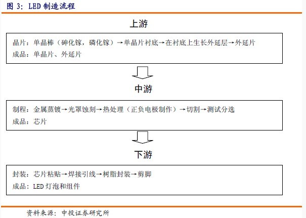 LED的制作流程包括上游的單晶片襯底制作、外延晶片生長,中游的芯片、電極制作、切割和測試分選,以及下游的產(chǎn)品封裝。