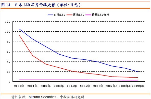 日本LED廠商供應(yīng)的白光LED價格已從2000年的每顆105日元(約1美元),下跌到2005年的44日元(不到0.5美元)、2009年的20日元;藍(lán)光LED價格從2000年的每顆92日元跌至2005年的17日元,預(yù)計2009年下降到8日元。預(yù)計2008年全年跌幅在10%左右。