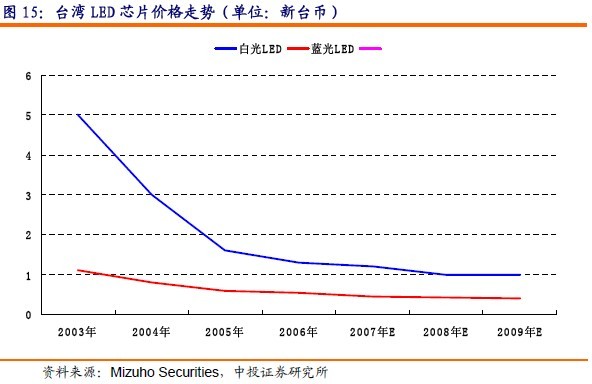 04年臺灣白光LED價格跌幅在30%以內(nèi),04年底的平均報價在2.5元左右,由于臺灣廠商積極進(jìn)入白光LED領(lǐng)域,05年價格跌幅達(dá)到30%。