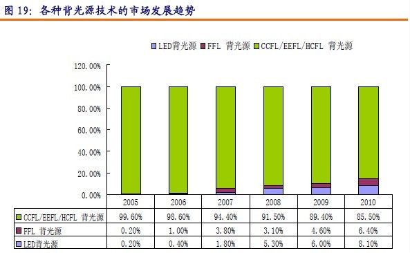 可以看出,從2006年到2008LED背光源的快速成長期。如果按照2010年TFT-LCD市場銷售額950億美元,背光模組占其中20%計算,屆時背光模組的份額約為190億美元。據(jù)此推算,LED背光模組份額為15.39億美元,這是比較保守的估計。