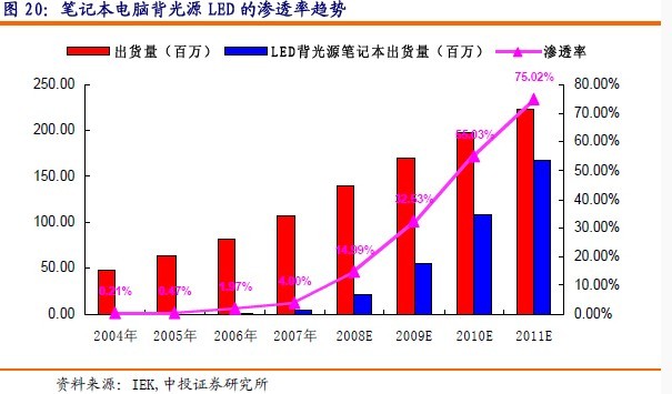 預(yù)計筆記本電腦的出貨量將從2004年的47.1百萬臺增長到2011年的223百萬臺,其中采用LED背光源的筆記本電腦將從2004年的0.1百萬臺增長到2011年的167百萬臺左右,滲透率2011年將達(dá)到75%左右,而在2004年滲透率只有0.2%。其中每部筆記本電腦用LED顆數(shù)是40-60個。