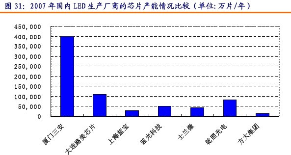 我們以截止2007年底為止,對三安光電和臺灣上游外延廠商的MOCVD設(shè)備及外延片、芯片產(chǎn)能進(jìn)行比較。
