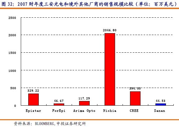 三安光電2007年的銷售規(guī)模為44.53百萬美元,其規(guī)模和臺灣的璨圓光電規(guī)模相當(dāng),但和臺灣的晶圓光電、華上光電及美國的CREE公司相比,其銷售規(guī)模還有比較大的差距。