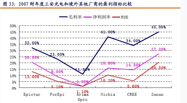 從盈利指標(biāo)來看,2007年度三安光電的銷售毛利率達(dá)到45%,凈利潤率達(dá)到27.2%,REO為20.50%,遠(yuǎn)高于其他國際大廠的盈利指標(biāo)。其中可能的原因分析來看,國內(nèi)MOCVD設(shè)備折舊年限、國內(nèi)制造費用先對較低、臺灣廠商進(jìn)入2008年實行股權(quán)、股票、分紅等激勵措施的原因造成國內(nèi)上游LED廠商的盈利能力平均高于國外廠商。