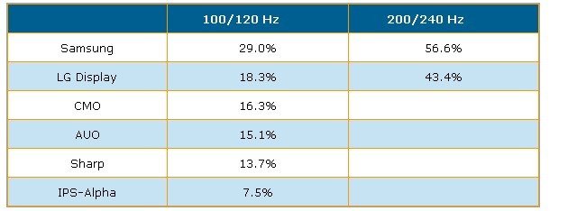 根據(jù)DisplaySearch調(diào)查指出,第二季全球采用倍頻及雙倍頻掃描技術(shù)液晶電視面板出貨達(dá)到640萬(wàn)片,出貨量市占率達(dá)18.3%,較上一季提高2%。以廠商別來看,Samsung以29%市占率居100/120Hz出貨量排名冠軍,LG Display以18.3%是占率居次,CMO(奇美)、AUO(友達(dá))、Sharp與IPS-Alpha分居第三到六名。在雙倍頻面板出貨量方面,主要為韓國(guó)二家面板廠商所主導(dǎo),市占率如表二所示。