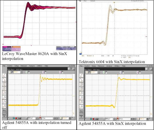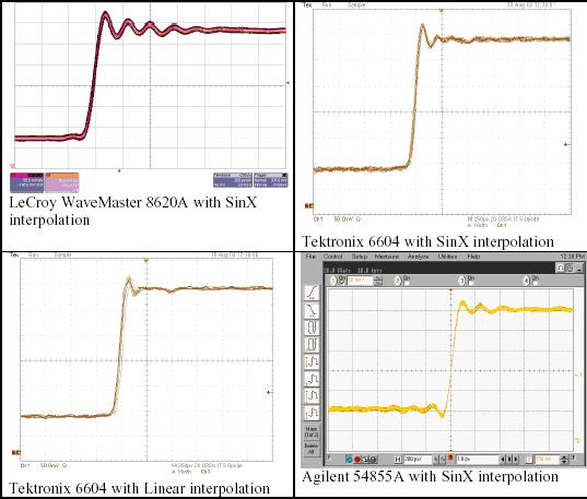 我們使用三種競爭的DSO進(jìn)行簡單的試驗(yàn),其分別是力科Wavemaster 8620A、泰克6604和安捷倫54855A。這三種示波器的帶寬指標(biāo)都是6 GHz,最大采樣率是20 GS/s。我們使用六種不同的信號和采樣率組合,說明SinX內(nèi)插算法的性能。