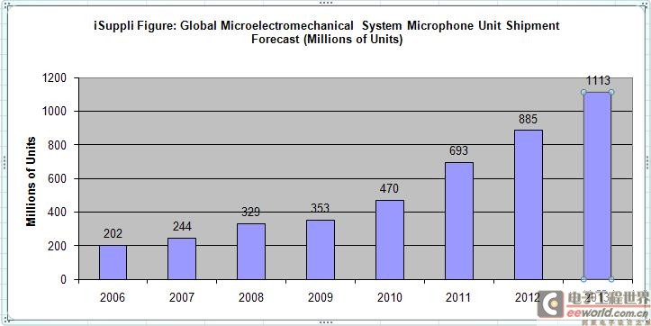 “經(jīng)過連續(xù)五年的兩位數(shù)成長,全球MEMS麥克風出貨量在2009年僅盡會成長7。5%,”Bouchaud觀察到。“隨著疲軟的出貨量成長率加上價格下跌,全球MEMS麥克風營收將從2008年的1。357億美元下降至2009年的1。324億美元,約下跌2。4%。”