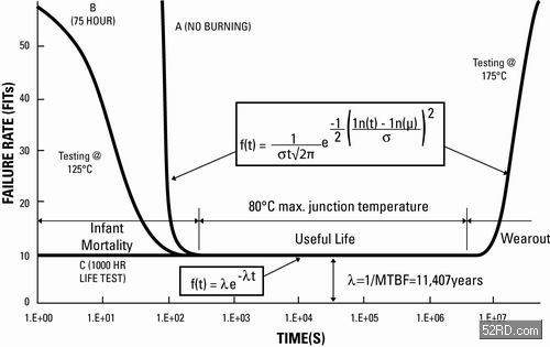 第1個區(qū)段描述了裝置的失敗率。只要在生產(chǎn)裝置中進(jìn)行若干測試,就可以把故障率降低到一個在實際運行中可以接受的水平。第2個區(qū)段描述了實際工作壽命中有可能出現(xiàn)的隨機(jī)故障。它們與時間無關(guān),有關(guān)裝置也不會預(yù)先替換,一般都會在發(fā)生故障時才會被替換。第3個區(qū)段顯示了裝置的壽命接近終結(jié)而開始出現(xiàn)損耗。假如不加以替換,有一半產(chǎn)品都會在壽命中期開始失效。