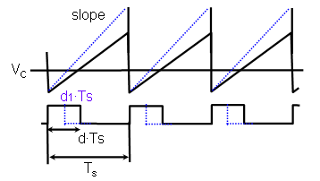 ,Vc=k*d*Ts輸入電壓前饋就是在內(nèi)部鋸齒波上加入隨輸入電壓變化的斜坡,或者從VC信號(hào)減去此斜坡。當(dāng)輸入電壓突然增加時(shí),內(nèi)部鋸齒波和外加斜坡之和的波形為圖3中的虛線所示。若外加斜坡的斜率為ks,則總的斜率為:k+ks,注意到:ks∝Vin,也就是ks=k*Vin*Vin,所以此時(shí)的占空比為:
