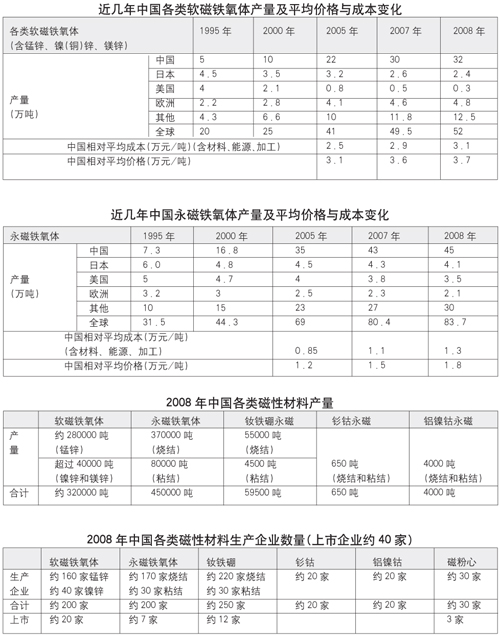 中國(guó)磁性材料產(chǎn)量以15%以上的年增長(zhǎng)率發(fā)展,到2008年,中國(guó)軟磁鐵氧體產(chǎn)量已達(dá)32萬噸,永磁鐵氧體45萬噸,燒結(jié)釹鐵硼永磁5萬噸,粘結(jié)釹鐵硼永磁0.45萬噸,釤鈷永磁0.65萬噸,鋁鎳鈷永磁0.4萬噸。